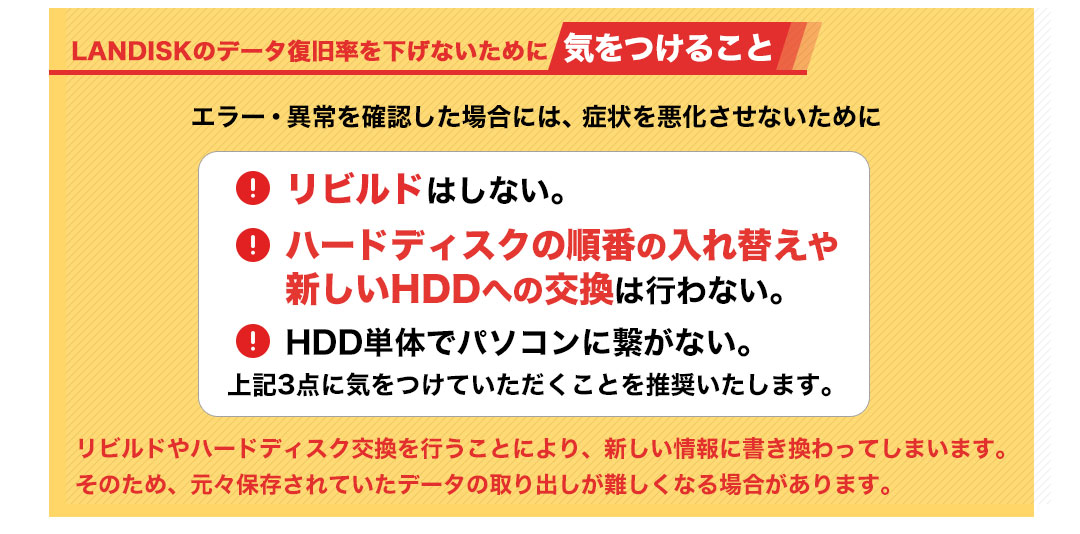 そのため、「必要なデータがLANDISK内に残ったまま」「バックアップが取れていない」等の場合は、データ復旧を行ってから修理を依頼されることをお勧めします。