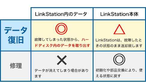 修理はLinkStationをまた使える状態に直すことであり、メーカーなどに修理を依頼されると、中のデータまでは保証されず、初期化してLinkStationが使えるように直す場合もあります。