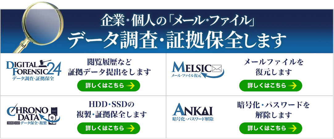 一つでも多くの確かな証拠データを割り出すために、信頼の技術力を持った当社をお選びいただくことをおすすめいたします。