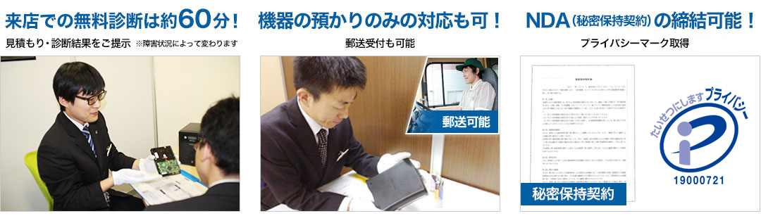 お電話でご予約後、その場で無料診断。症状の分析と復旧が可能な状態か、御見積もりが可能です。