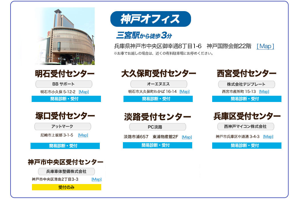 お客様の近くで対応できるよう、兵庫県には9箇所の窓口があり、それぞれ簡易診断や受付が可能です。また、全国各地に窓口を設けております。店舗への持込が難しい地域の方々には、ご郵送での受付も行っております。