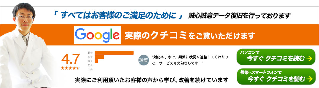 データを無事にお渡しし、その日のうちからお客様は業務を再開することができました。一時はどうなることかと思った・・・とお客様はかなり焦燥感を持っていらっしゃいましたが、データが復旧できることと、即日でデータをお渡ししたことにより、大変喜ばれていました。